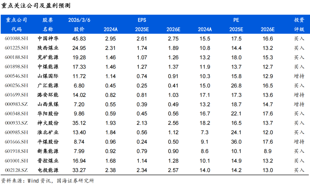 从大方向来看,煤炭开采行业供应端约束逻辑未变,需求端可能阶段性起伏波动,价格亦呈现一定震荡和动态再平衡。复盘行业30年经验,煤炭价格呈现震荡向上趋势,背后的驱动因素包括人工成本刚性上涨,安全投入、环保投入的持续加大,原材料动力等大宗商品涨价,以及地方政府加大征税力度等,从行业发展大趋势来看,上述驱动因素依然存在,煤价长期内仍然有上涨的诉求,过程可能是曲折的,但是方向应该是明确的。头部煤炭企业资产质量高,账上现金流充沛,呈现“高盈利、高现金流、高壁垒、高分红、高安全边际”五高特征。同时2025年起国家能源集团、山东能源集团、中国中煤能源集团、国家电投集团等多家煤炭央国企对旗下上市公司启动增持与资产注入计划,亦释放利好,彰显煤企发展信心、增厚企业成长性与稳定性。建议把握低位煤炭板块的价值属性,维持煤炭开采行业“推荐”评级。重点关注:(1)稳健型标的:中国神华、陕西煤业、中煤能源、电投能源、新集能源。(2)动力煤弹性较大标的:兖矿能源、晋控煤业、广汇能源、力量发展。(3)焦煤弹性较大标的:神火股份、淮北矿业、平煤股份、潞安环能、山西焦煤。