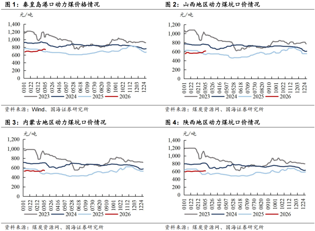 本周山西、内蒙古、陕西坑口价格分别环比上涨、下降、上涨:截至3月6日,大同南郊弱粘煤(Q5500)坑口含税价为615元/吨,周环比上涨12元/吨;鄂尔多斯Q5500动力煤坑口含税价为542元/吨,周环比下降7元/吨;陕西榆林神木Q6000动力煤坑口含税价为615元/吨,周环比上涨3元/吨。