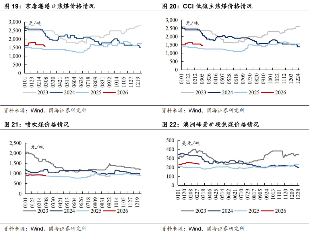 炼焦煤和焦炭来看,对于炼焦煤,本周样本煤矿产能利用率周环比+13.46pct至84.6%,主要系春节后陆续复工复产。蒙煤方面,本周持续高位运行,3月2日-3月5日甘其毛都口岸通关4天,日均通关1405车,较上周同期环比增加74车。需求端,本周铁水产量周环比-5.81 万吨至227.52万吨。库存端,下游焦企多数消耗厂内库存,以刚需采购为主。本周焦煤生产企业库存相较周环比+14.51 万吨。整体来看,供给端,节后国内煤矿陆续复产、蒙煤通关车数迅速提升。需求端,两会限产下铁水周环比下滑,焦化厂维持原料消耗。供需阶段性宽松,焦煤矿山库存环比小幅累积,截至3月6日,港口主焦煤价格1,580.00元/吨(周环比-80.00 元/吨)。后续关注铁水产量、进口及国内煤矿复产表现,原油扰动下动力煤价格淡季表现以及保供产能政策后续情况。对于焦炭,供给端,由于两会召开,部分企业开工受限,本周焦企产能利用率周环比-0.13pct至74.06%。需求端,本周铁水产量周环比-5.81 万吨至227.52万吨。库存端,两会影响下河北地区部分钢厂开始执行限产,本周独立焦化厂焦炭库存相较周环比上升。整体来看,本周开启首轮提降,并于3月6日正式落地,降幅为50-55元/吨,焦炭市场偏弱运行,后续关注两会期间钢焦生产变动以及上游煤价情况。