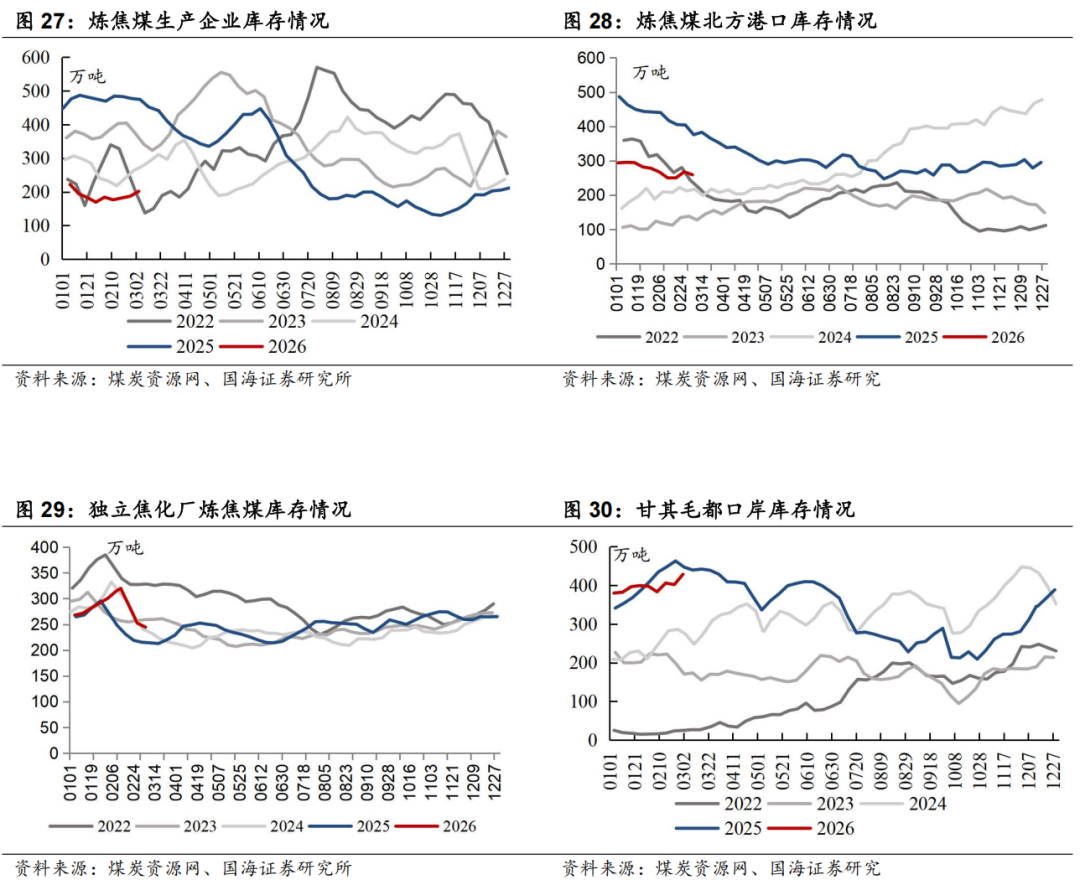 近期炼焦煤市场小结及展望:本周样本煤矿产能利用率周环比+13.46pct至84.6%,主要系春节后陆续复工复产。蒙煤方面,本周持续高位运行,3月2日-3月5日甘其毛都口岸通关4天,日均通关1405车,较上周同期环比增加74车。需求端,本周铁水产量周环比-5.81 万吨至227.52万吨。库存端,下游焦企多数消耗厂内库存,以刚需采购为主。本周焦煤生产企业库存相较周环比+14.51 万吨。整体来看,供给端,节后国内煤矿陆续复产、蒙煤通关车数迅速提升。需求端,两会限产下铁水周环比下滑,焦化厂维持原料消耗。供需阶段性宽松,焦煤矿山库存环比小幅累积,截至3月6日,港口主焦煤价格1,580.00元/吨(周环比-80.00 元/吨)。后续关注铁水产量、进口及国内煤矿复产表现,原油扰动下动力煤价格淡季表现以及保供产能政策后续情况。