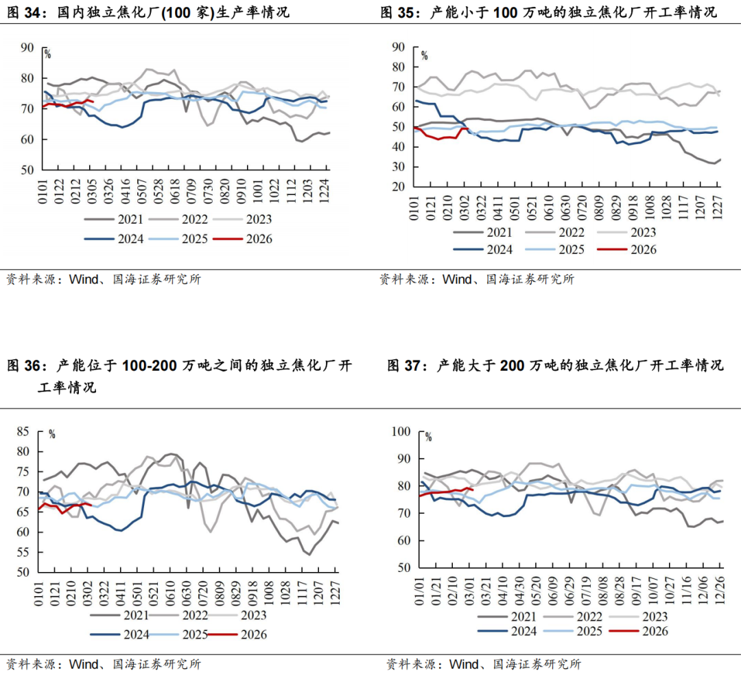 本周焦化厂生产率环比分化:截至3月6日,国内独立焦化厂(100家)焦炉生产率72.27%,周环比下降0.6个pct,产能小于100万吨的焦化企业(100家)开工率49.03%,环比持平,产能在100-200万吨的焦化企业(100家)开工率66.62%,环比下降0.5个pct,产能大于200万吨的焦化企业(100家)开工率78.5%,环比下降0.7个pct。