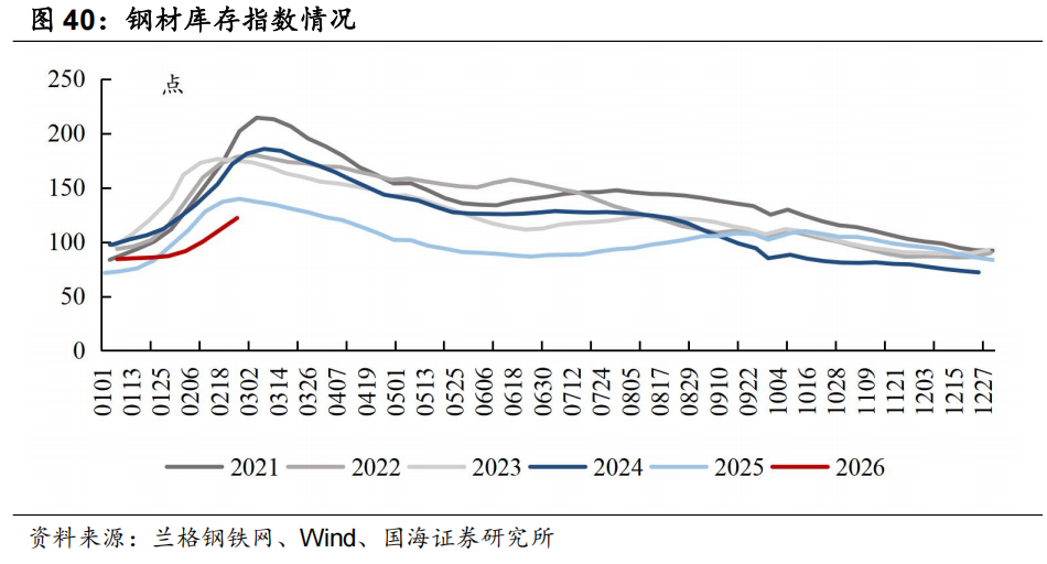 本周钢材库存指数环比上升:截至3月4日,本周兰格钢材库存指数(综合)为139.9点,周环比上升17.9点。