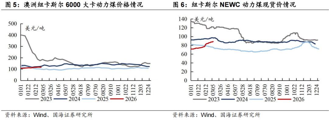 截至2月27日,国际6000大卡动力煤价格环比下降,本周国际5500大卡动力煤价格环比上升:截至2月27日,纽卡斯尔6000大卡动力煤价格为115.71美元/吨,周环比下降1.7美元/吨;截至3月5日,纽卡斯尔5500大卡动力煤(2#)价格为88.5美元/吨,周环比上升1.0美元/吨。