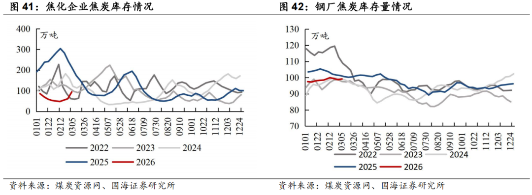 本周焦化企业焦炭库存环比上升,钢厂焦炭库存量环比上升:截至3月4日,独立焦化厂焦炭库存94.2万吨,周环比上升33.0万吨;截至3月6日,国内钢厂焦炭库存99.17万吨,周环比上升0.4万吨。
