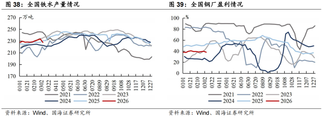 本周全国铁水产量环比下降:截至3月6日,全国日均铁水产量(247家)为227.52万吨,周环比下降5.81万吨。