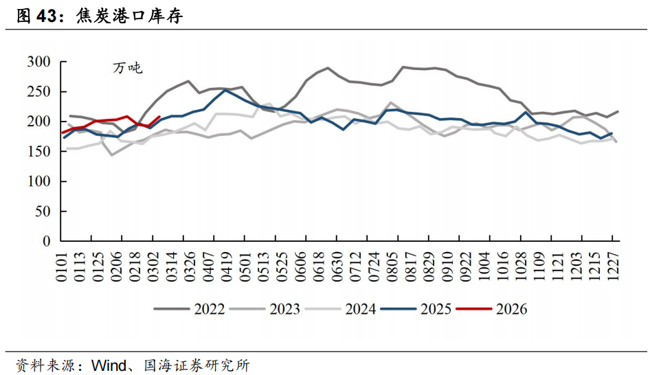本周炼焦煤北方港口库存环比下降:截至3月6日,炼焦煤北方港口库存为259.15万吨,周环比下降8.4万吨。