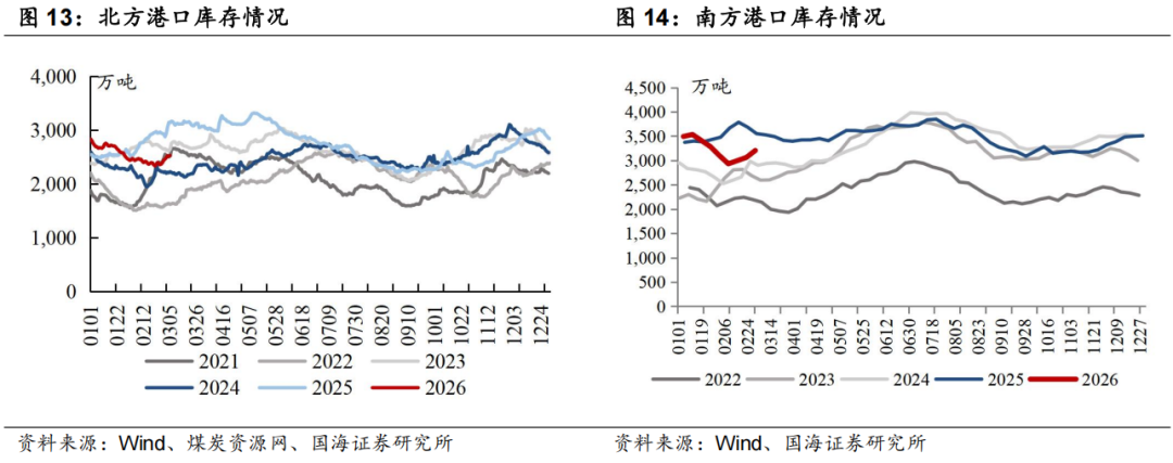 本周北方港口库存环比上升:截至3月5日,北方港口库存为2524.8万吨,周环比上升156.1万吨。截至3月2日,南方主流港口库存为3204.7万吨,周环比上升143.4万吨。